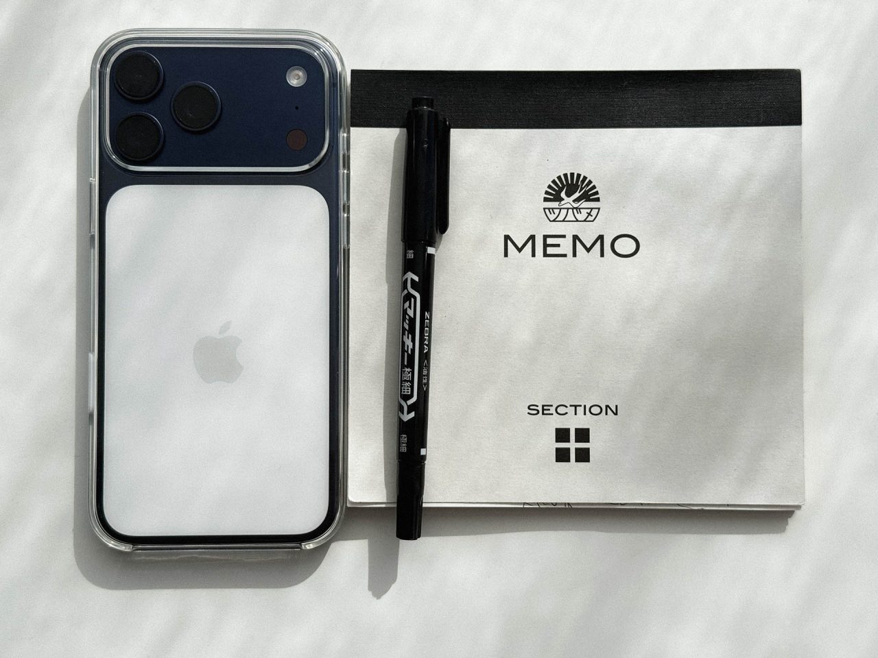 撮影のアイデアが思いついた時に書き出しておく用に、比較的携帯しやすく書きやすいこちらを使用しています。マッキーはフィルムの増感を書き込む時に必要なのでカメラバッグに必ず入れてあります。iphone は気になった場所を記録しておくカメラ兼メモとして完璧です。
