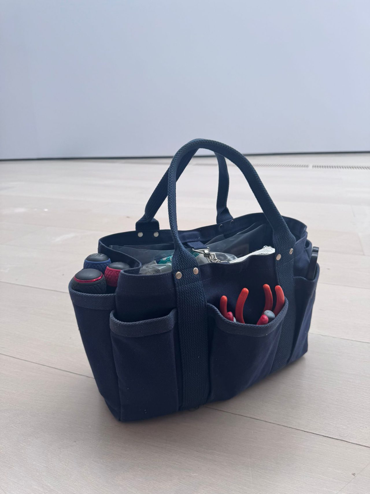 私がシェアしたいのは、それらを収納する道具袋の「松野屋のヘビーキャンバス ツールトート」。私が使っている S サイズは一番小さいけれど、どんな道具を入れても、どこに持っていっても、型崩れすることがまったくない。展覧会のインストールのためにニューヨーク、ボーフム、パリ、サンタンデールと移動中の今も、このバッグをスーツケースに入れて一緒に旅行している。現場では、ペンチ、カッター、接着剤各種、電材を扱う道具など、迷わずボンボン入れていく。ゆうに8キロを超える重さになってしまうから、他の袋だとすぐに穴が空いたり破れたりするけれど、このトートは大丈夫。10年くらい使い続けている。